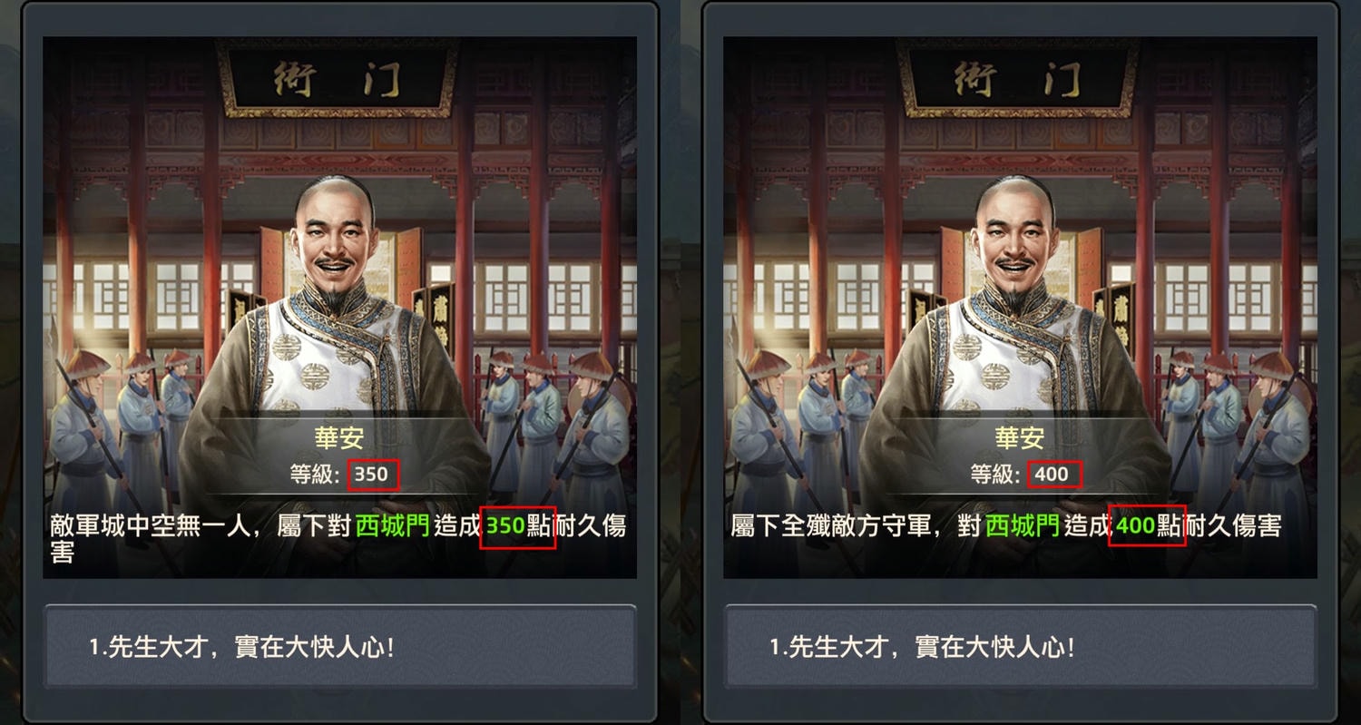 - 大人全殲駐守門客時,將對該城門/主城造成等同於進攻門客等級的耐久傷害(追捕翻倍)。