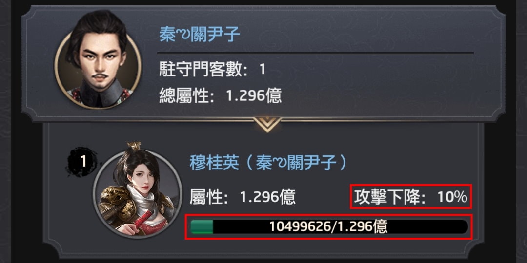 假設一個防守門客魏忠賢甲,第一次被遇到血量是正常的,若對方沒能擊退魏忠賢甲(若能擊退當然是直接從戰場上撤走),那該門客的基礎攻擊就會-10%。