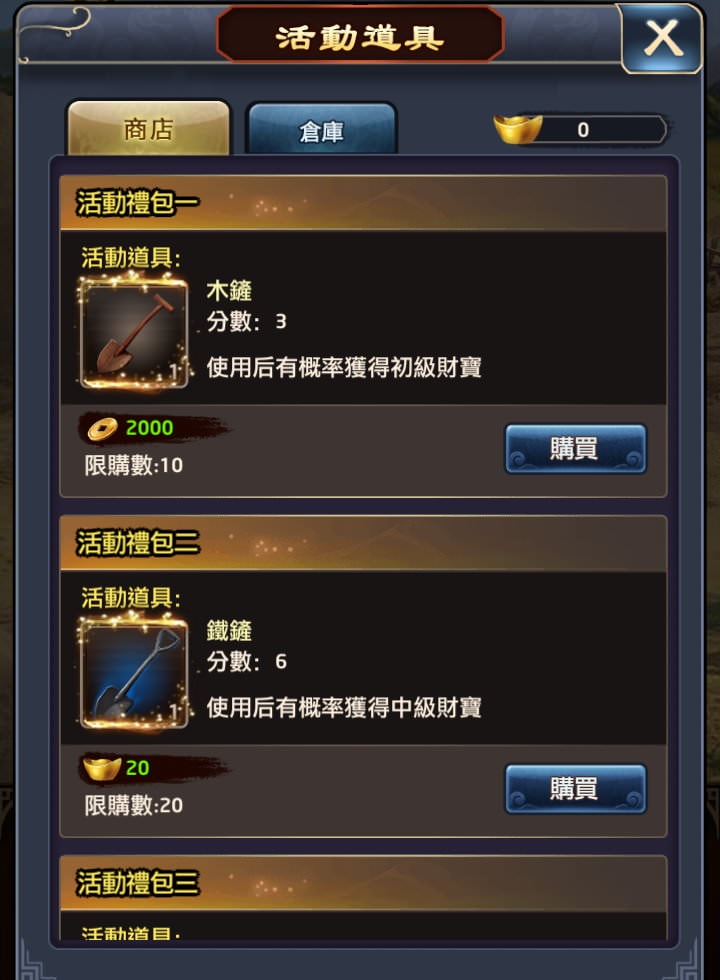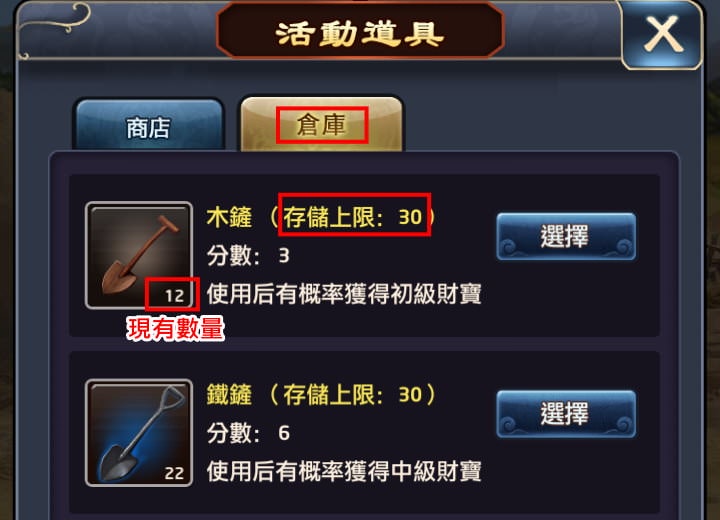 倉庫道具一的上限是30個,以「藏書閣」三天活動來說,若每天都先領「限時獎勵」,然後買10個道具一,在第3天買道具一買到一半就會出現倉庫已滿的訊息,變成只能存30個道具一到下次活動用。