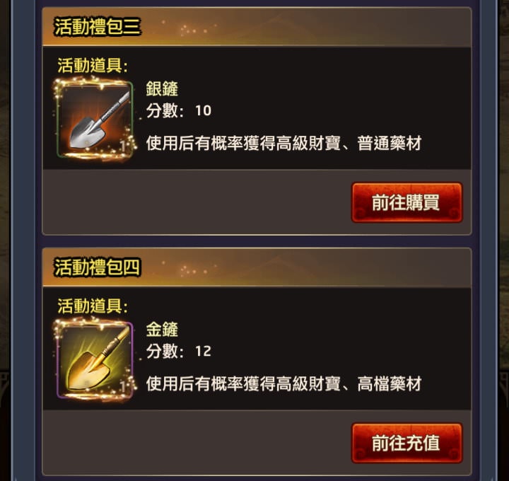 - 商城亦可用元寶購買「xx大禮包」(視衝榜內容而有對應商品),裡頭也會有道具3~4。