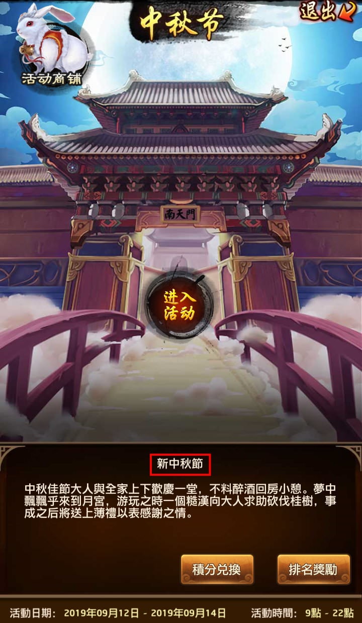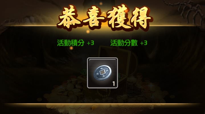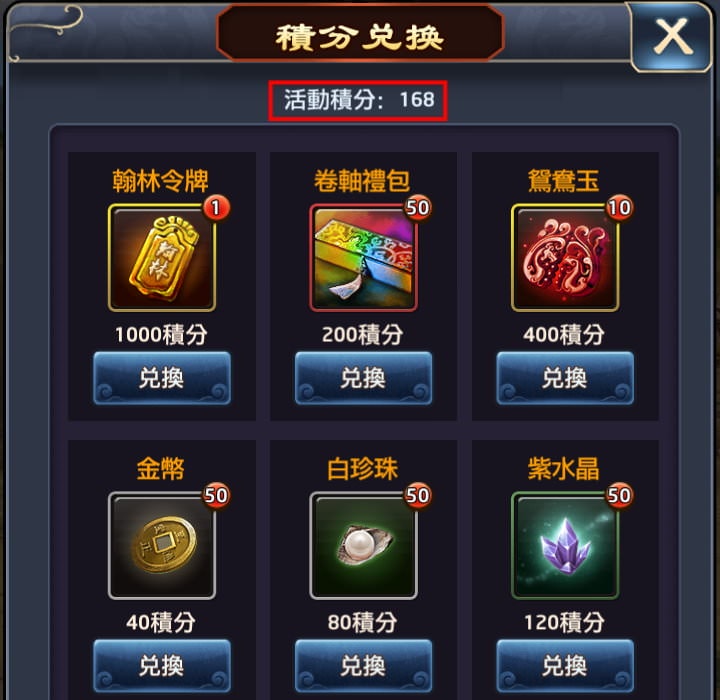 使用活動道具累積的積分,可以兌換各種物品,這些物品通常會跟當下的衝榜活動有直接關聯,像是「挖寶藏」都會搭配「勢力衝榜」,而兌換的道具也都能增加勢力:翰林令牌、卷軸禮包、鴛鴦玉(聯姻用)、銀兩(升級門客)。
