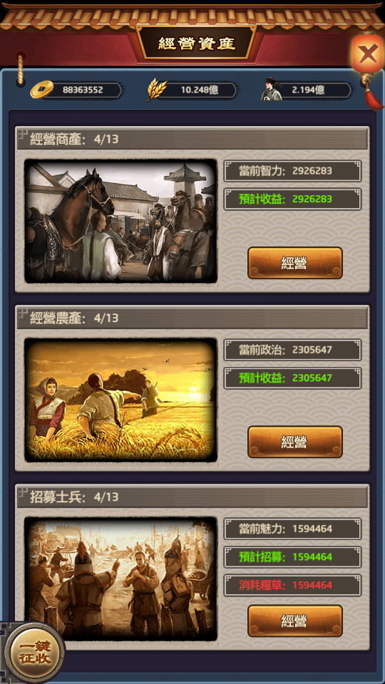 總智力有多少,每次就能收成多少銀兩,總政治有多少,每次就能收成多少糧食,總魅力有多少,每次就能收成多少士兵。