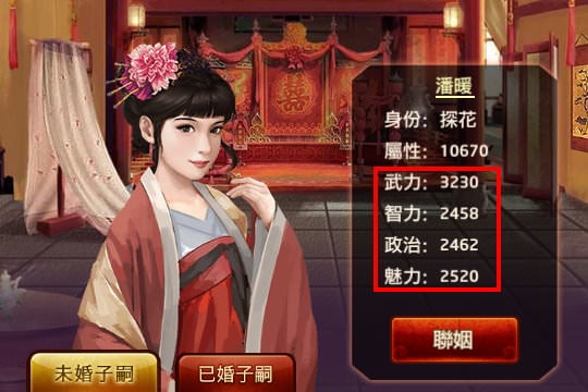 不過上面也提到遊戲中各種計算公式都是以總武力、總智力、總政治、總魅力去做為基數來計算的,若能靠盟友聯姻幫你大幅提昇勢力,還是很有幫助的。