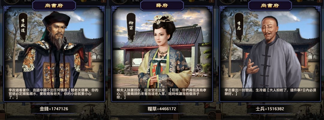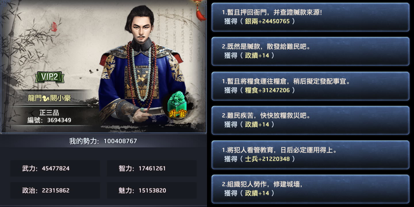 處理政務時,能得到多少銀兩跟總智力有關、糧食跟總政治有關、士兵跟總魅力有關,此外官品則決定倍數(小數點無條件捨去)。