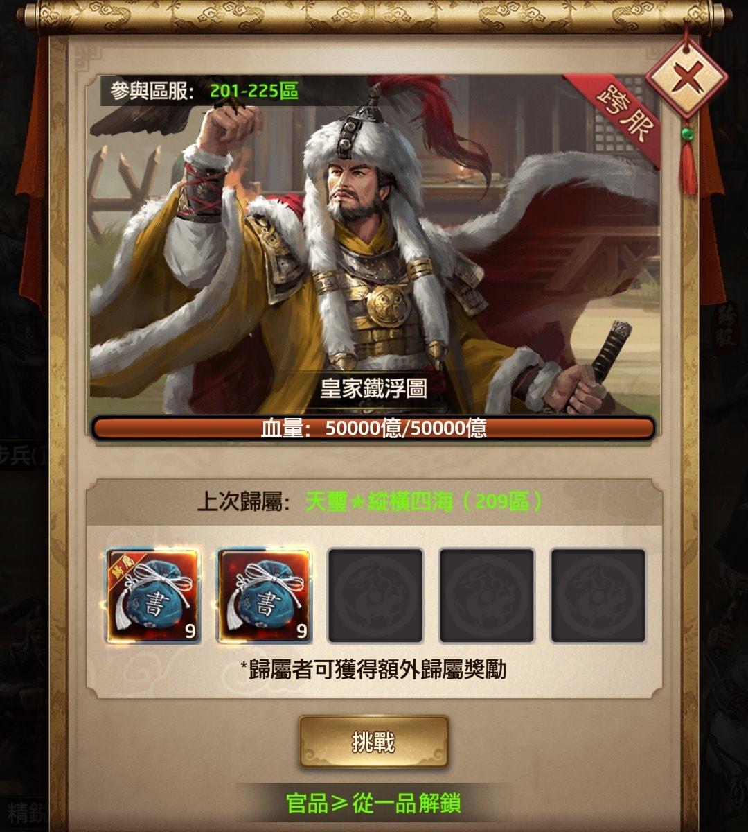 | 皇家鐵浮圖 | 從一品≤官品 | 25區 | 50,000億 | 書籍經驗包*9 | 書籍經驗包*9 | 180分鐘 |