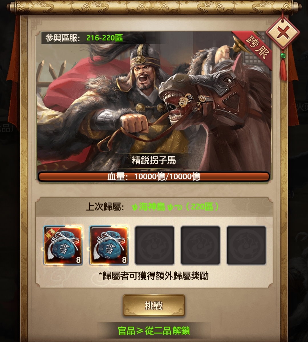 | 精銳拐子馬 | 從二品≤官品 | 5區 | 10,000億 | 書籍經驗包*8 | 書籍經驗包*8 | 120分鐘 |