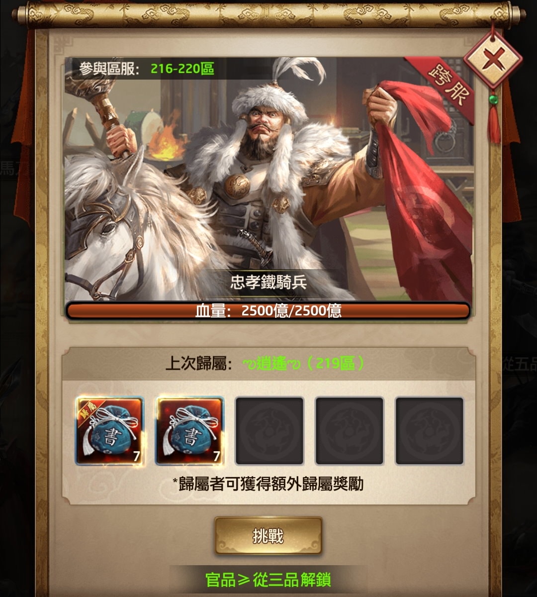 | 忠孝鐵騎兵 | 從三品≤官品 | 5區 | 2,500億 | 書籍經驗包*7 | 書籍經驗包*7 | 60分鐘 |