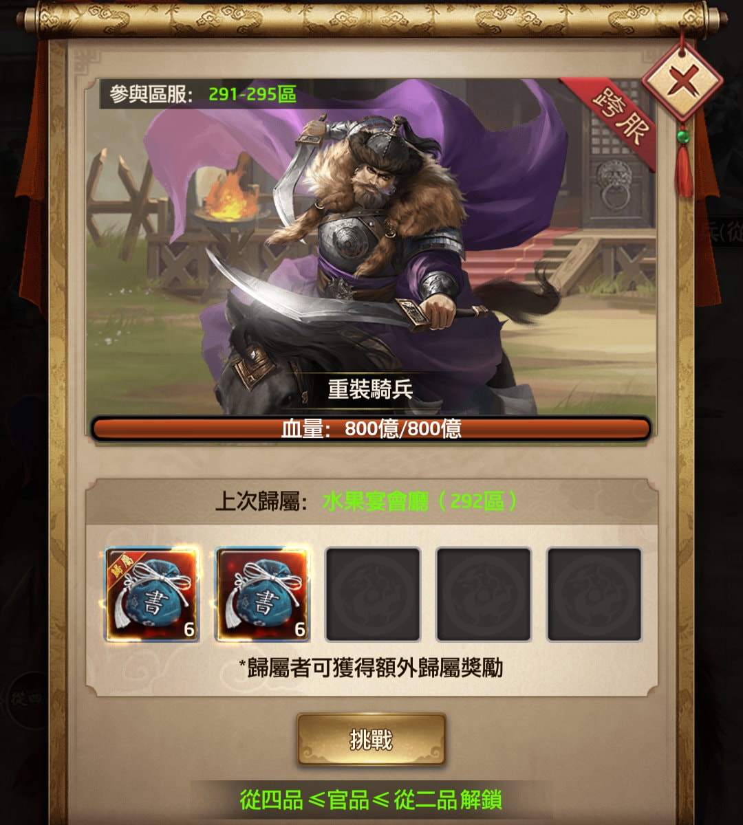 | 重裝騎兵 | 從四品≤官品≤從二品 | 5區 | 800億 | 書籍經驗包*6 | 書籍經驗包*6 | 30分鐘 |