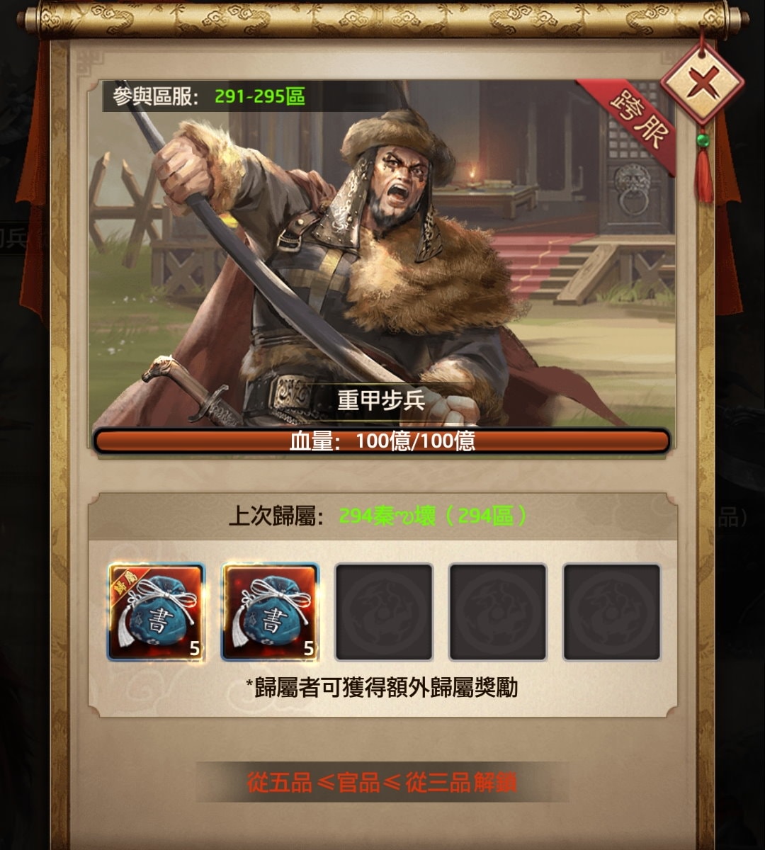 | 重甲步兵 | 從五品≤官品≤從三品 | 5區 | 100億 | 書籍經驗包*5 | 書籍經驗包*5 | 20分鐘 |