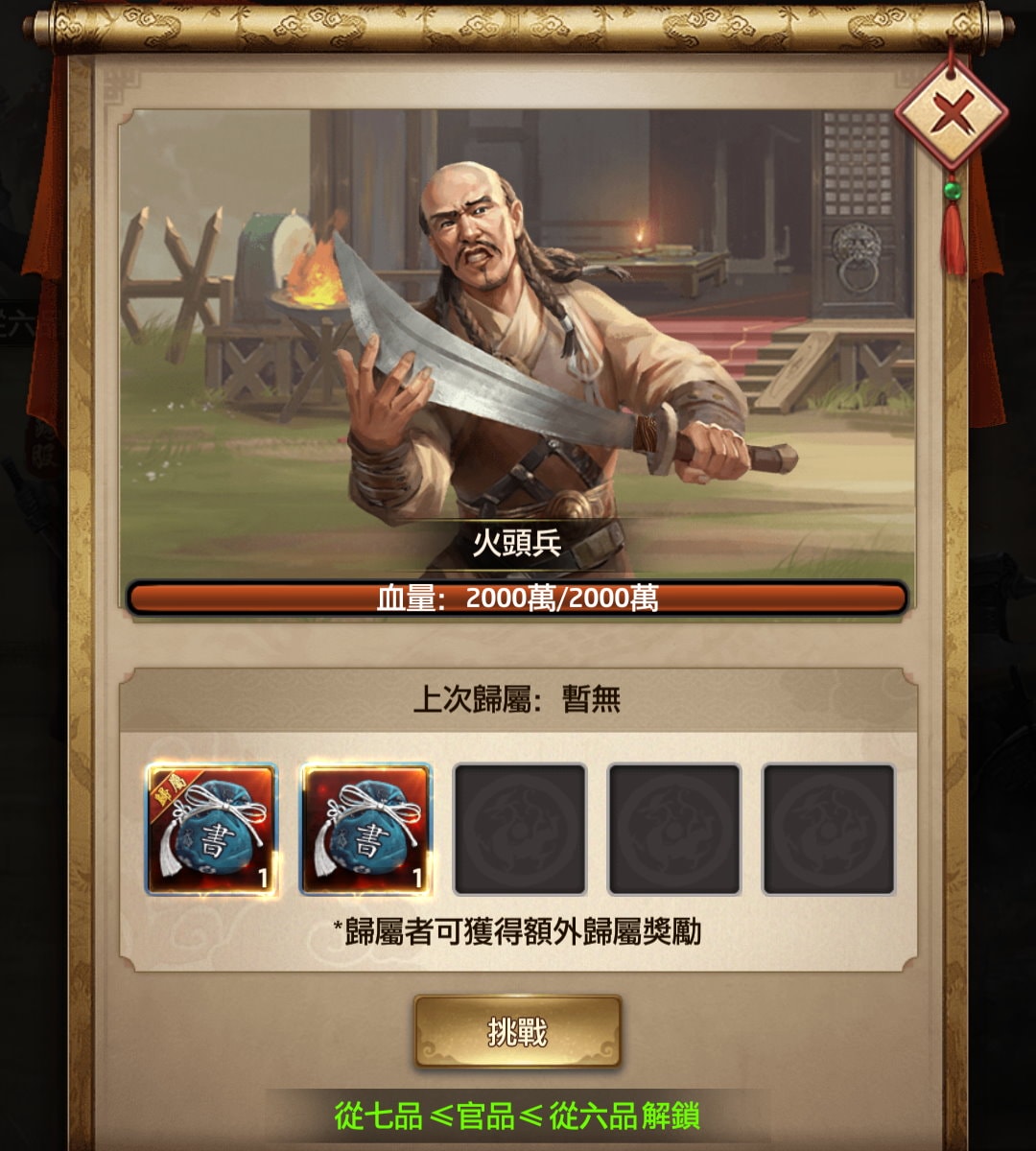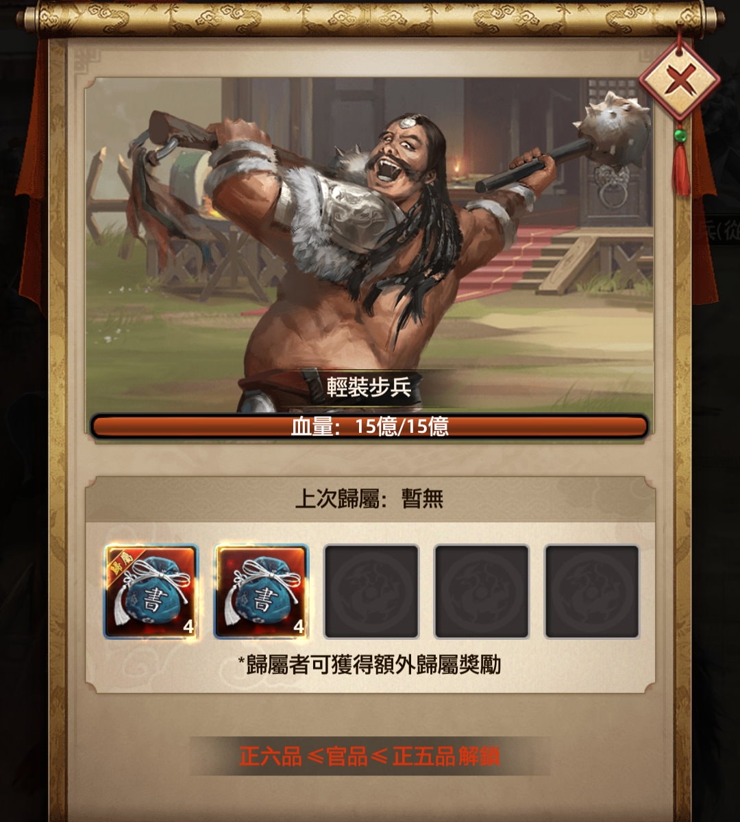 | 輕裝步兵 | 正六品≤官品≤正五品 | 1區 | 15億 | 書籍經驗包*4 | 書籍經驗包*4 | 15分鐘 |