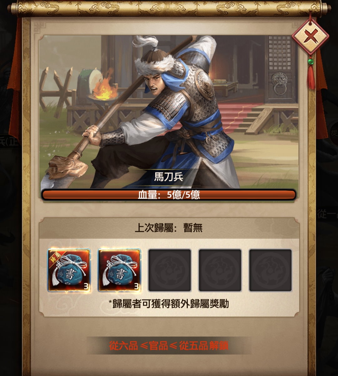 | 馬刀兵 | 從六品≤官品≤從五品 | 1區 | 5億 | 書籍經驗包*3 | 書籍經驗包*3 | 10分鐘 |