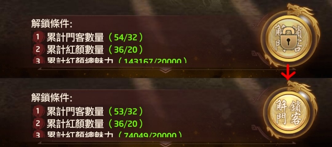 當完成「解鎖條件」後,「解鎖門客」上頭鎖頭的符號會消失,即可招募該門客。有些門客還需要消耗特定道具,目前招募二阿哥就得儲值98人民幣來取得九龍玉鈕。