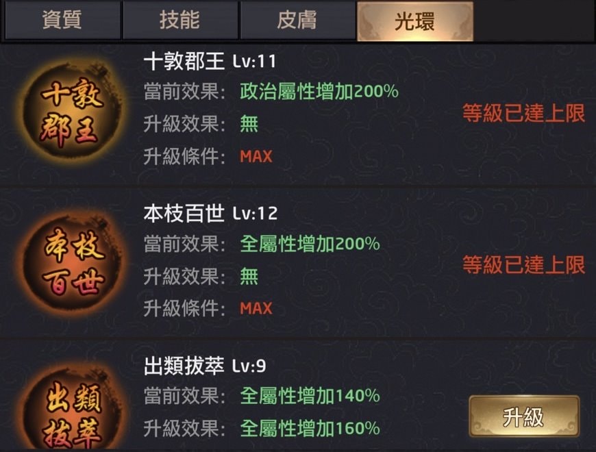 | 光環 | 效果(單級) | 升級辦法 | 等級上限 |