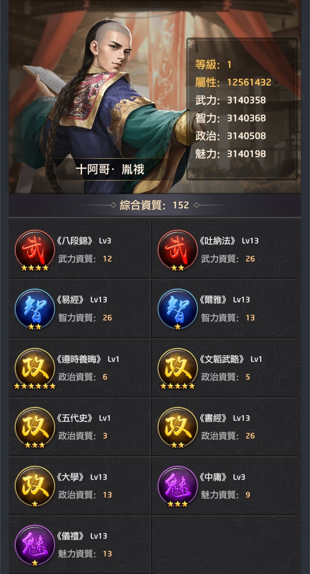 | 12 | 累計門客數量:103 | 全部屬性+250% |