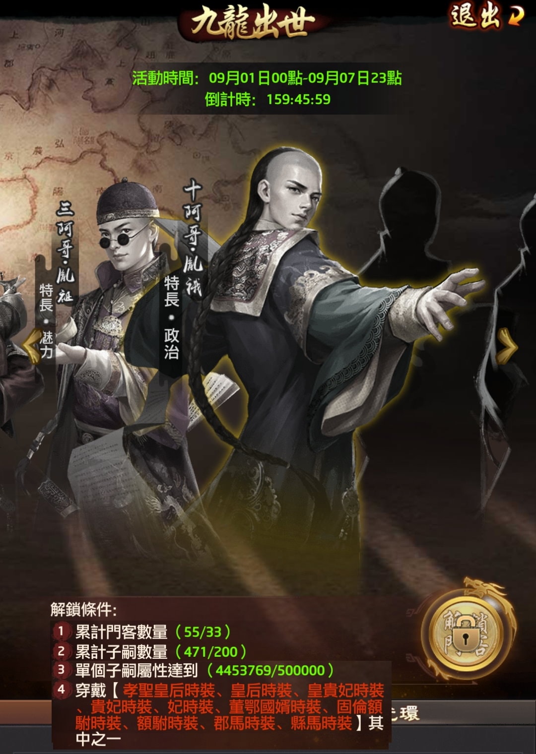 | 10 | 累計門客數量:83 | 全數屬性+160% |