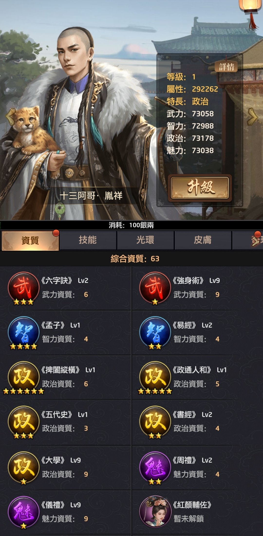 | 7 | 累計門客數量:63 | 全數屬性+110% |