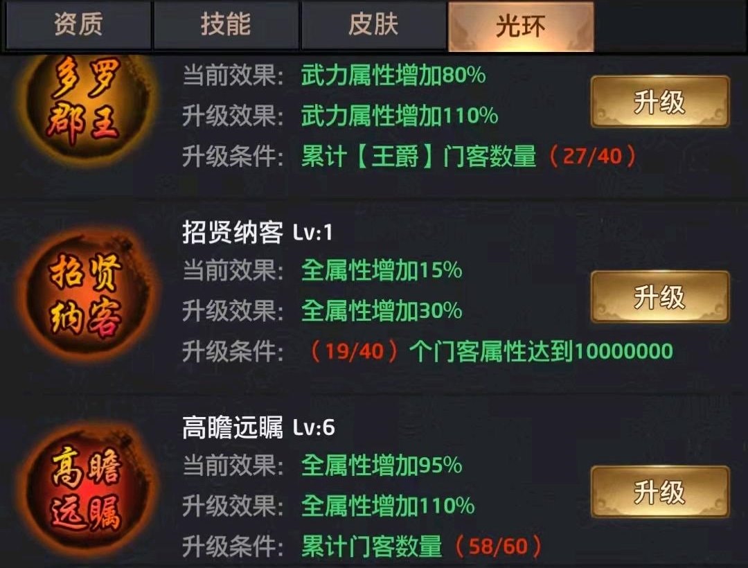 | 4 | 累計「侯爵」門客數量:40 | 武力屬性+60% |