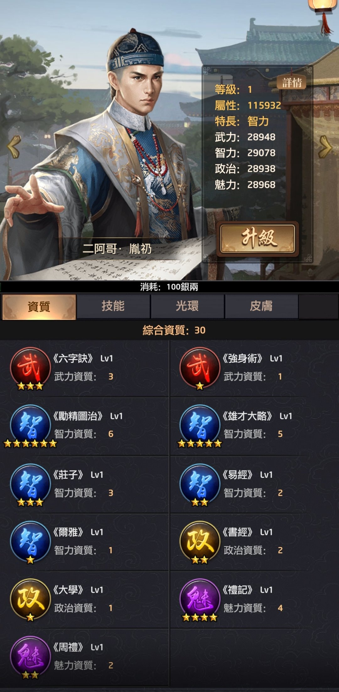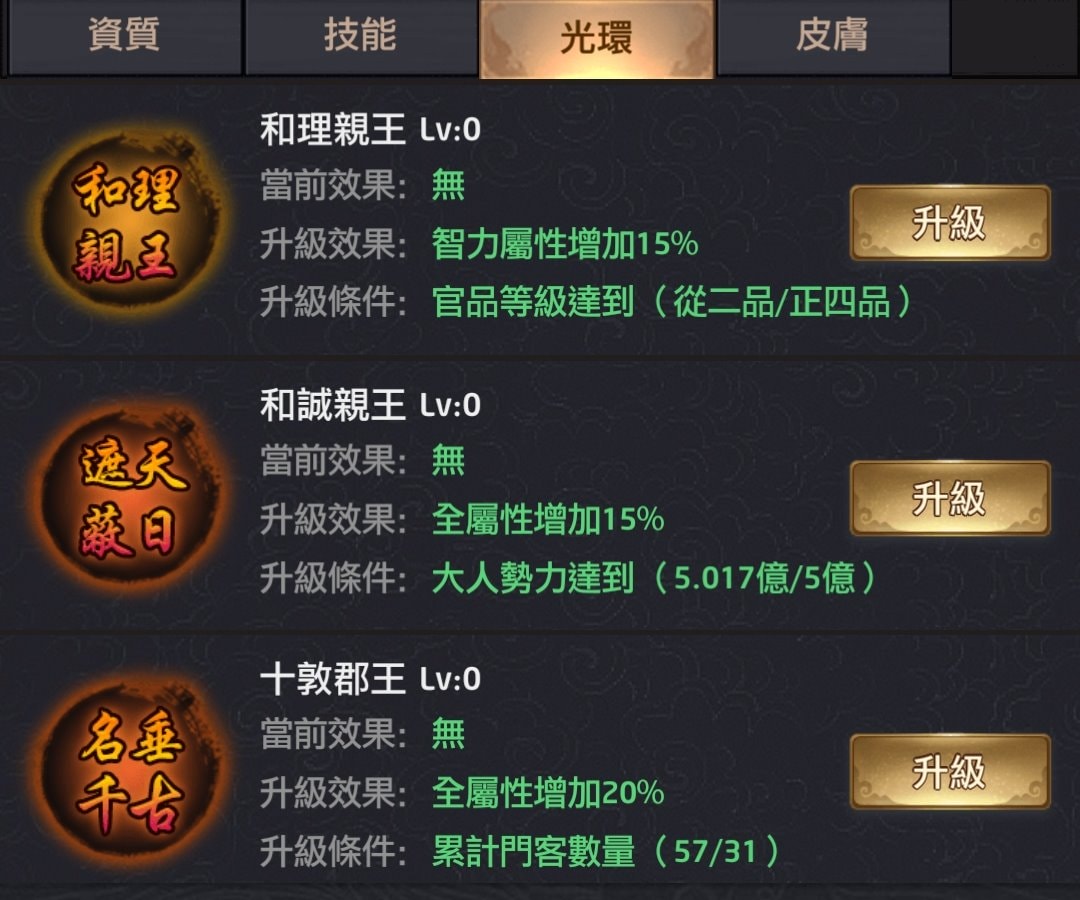 | 名垂千古 | 全部屬性+n% | 累計門客數量 | 12 |