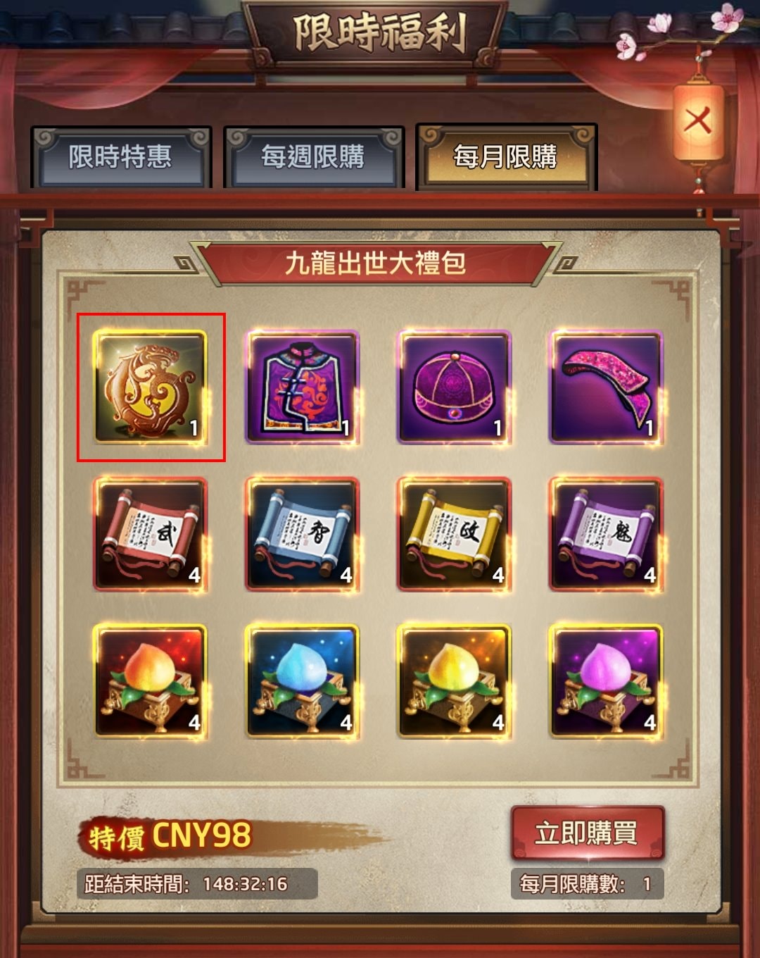 - 儲值98人民幣(500台幣)購買「九龍出世禮包」