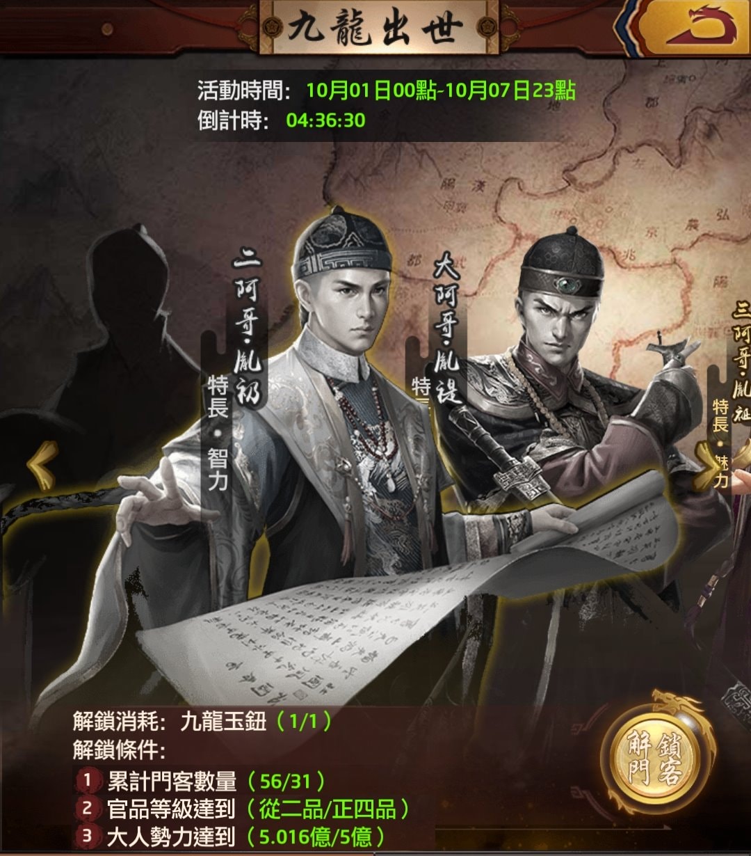 原本二阿哥的解鎖條件包含「穿戴皇帝以上的稱號」,招募大阿哥則包含得消耗「九龍玉鈕*1」,中國版在 2022/05/11 預告說下次出現九龍出世招募活動時,兩者的此項條件會交換。國際版也05/18跟進推出公告。