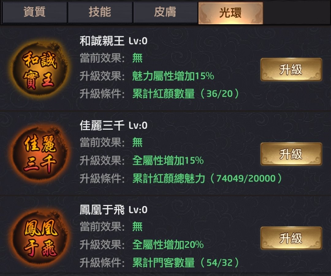 | 佳麗三千 | 全部屬性+n% | 累計紅顏總魅力 | 12 |