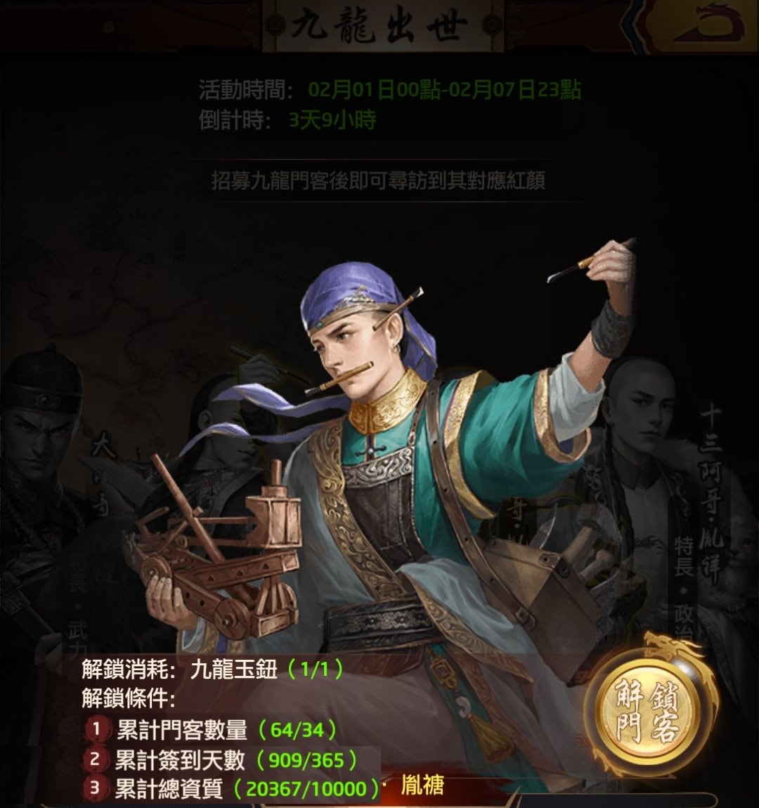 | 3 | 累計門客數量:42 | 全數屬性+50% |