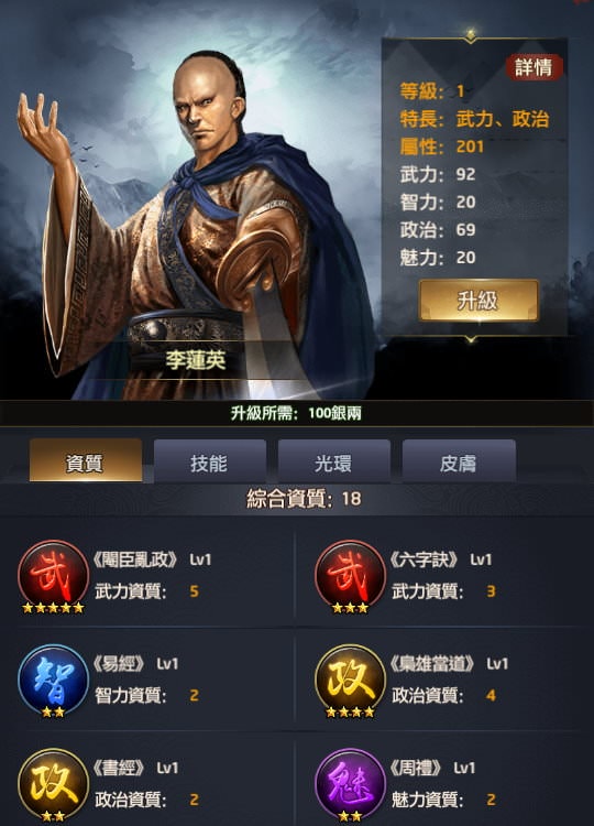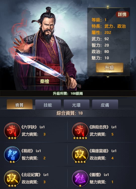 - 梟雄當道每升一級,該門客全部屬性+5%,每次升級消耗10個梟雄令,上限是10級。