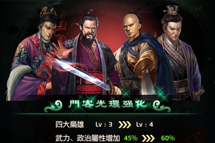 | 四大梟雄 | 武力、政治屬性+15% | 取得梟雄門客 | 4 |