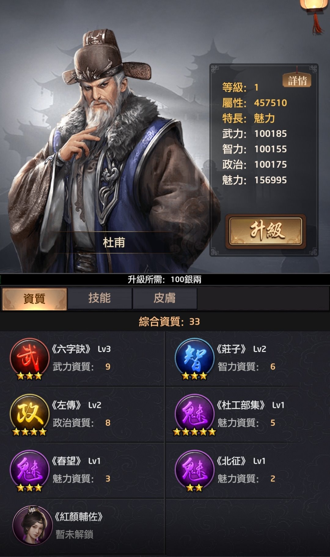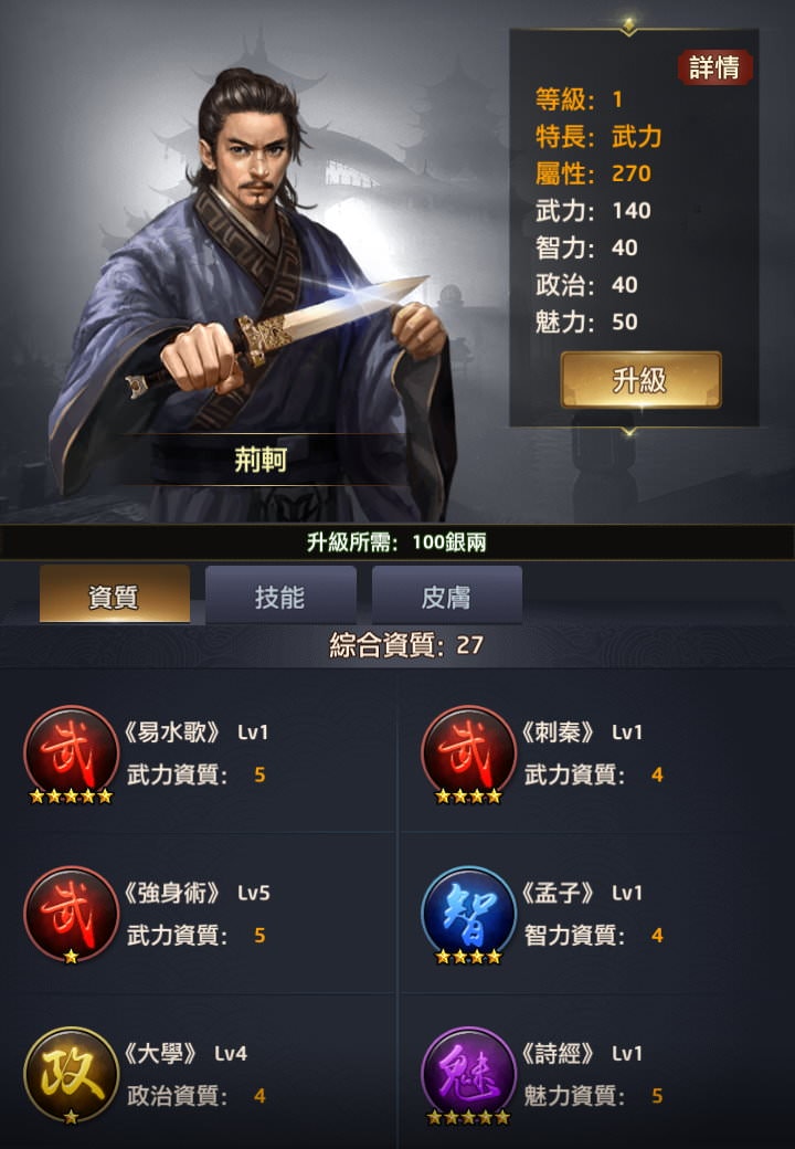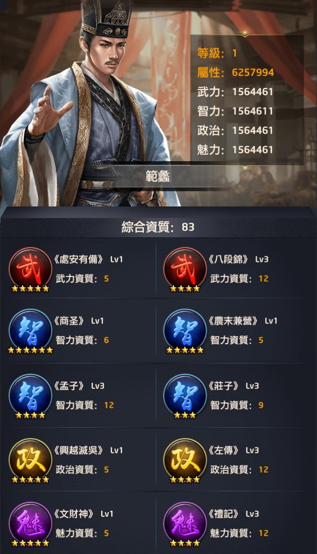 但把卷軸用在6星技能上太容易失敗,對沒充值/小額充值玩家來說無法賭這麼大,後來我都會改把魅力卷軸給高漸離、干將、高長恭等有3星、4星魅力的門客。而這位魅力將缺少卷軸後,很明顯在打衙門時是跟其他武力/智力/政治主將有落差的,無法拿來當n連殺門客。