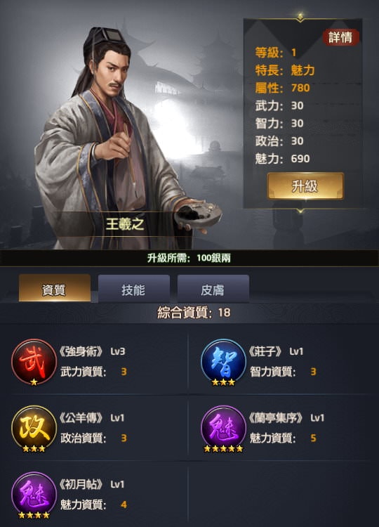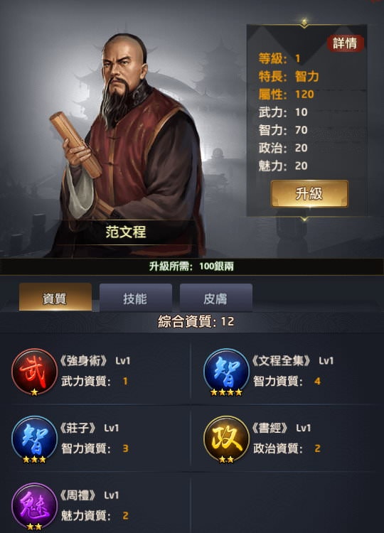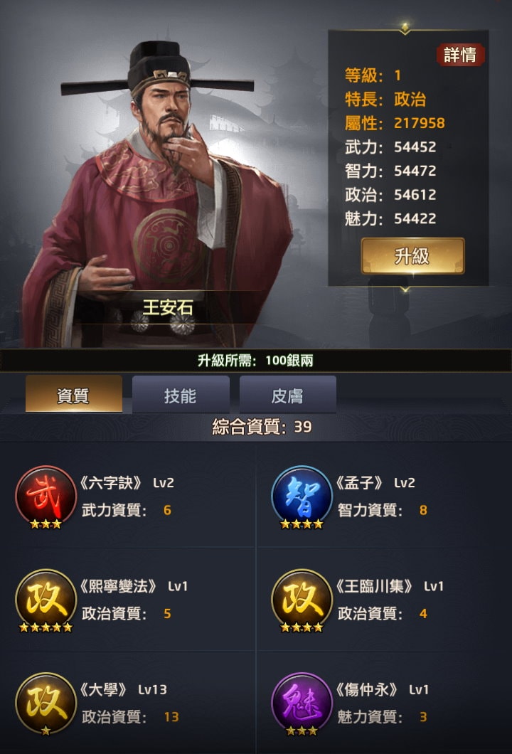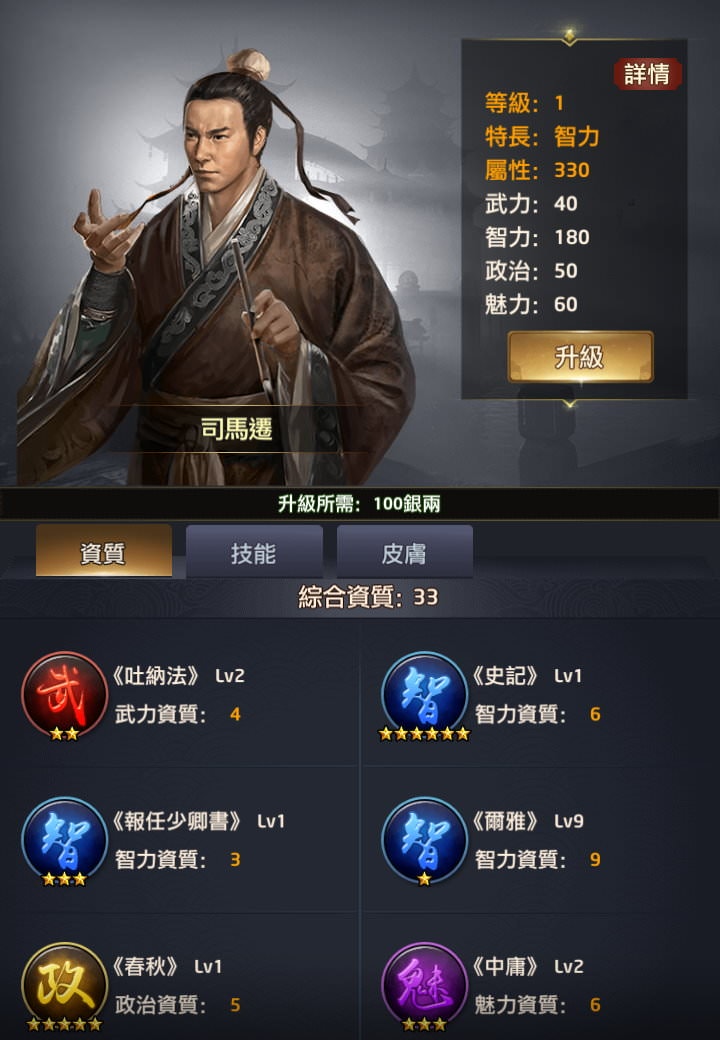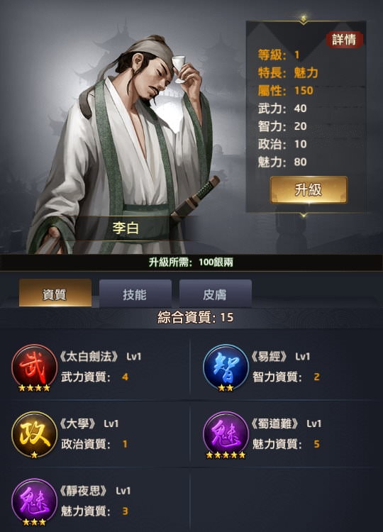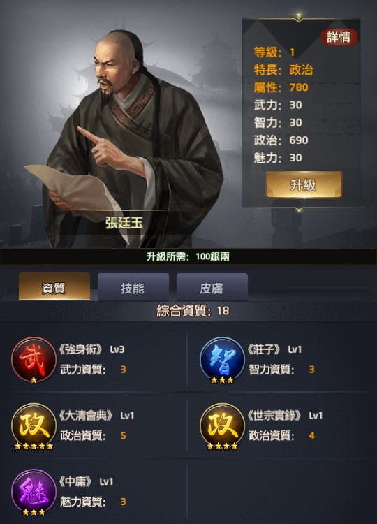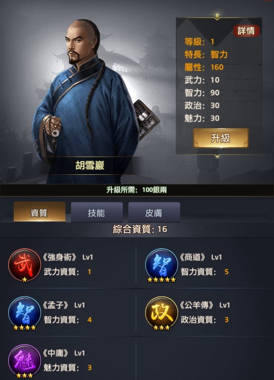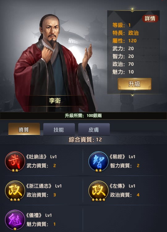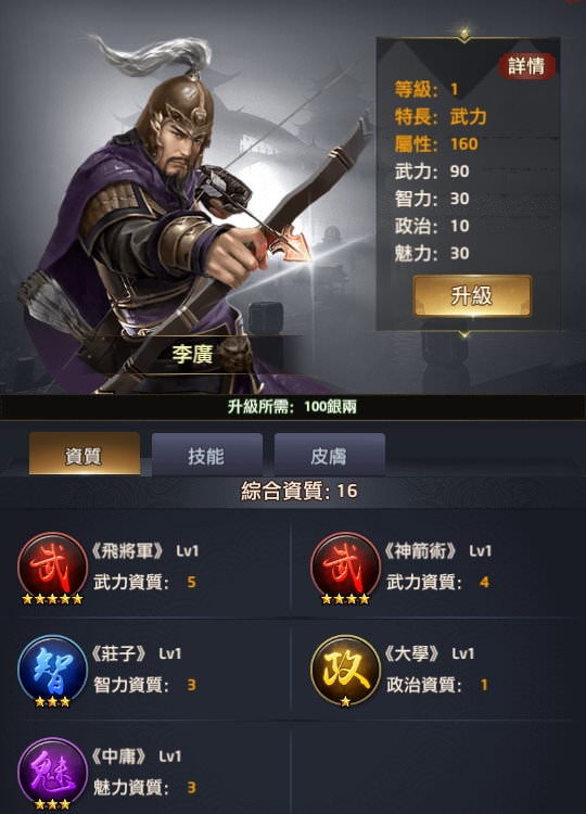 附註:每個玩家拿到新門客時「綜合資質」的資料會有些微差異,譬如我拿到李廣時是16,就是最初始的資質,但如果有在翰林升級過「所有門客大學技能+1」,這時李廣的綜合資質就會變成17或更多。