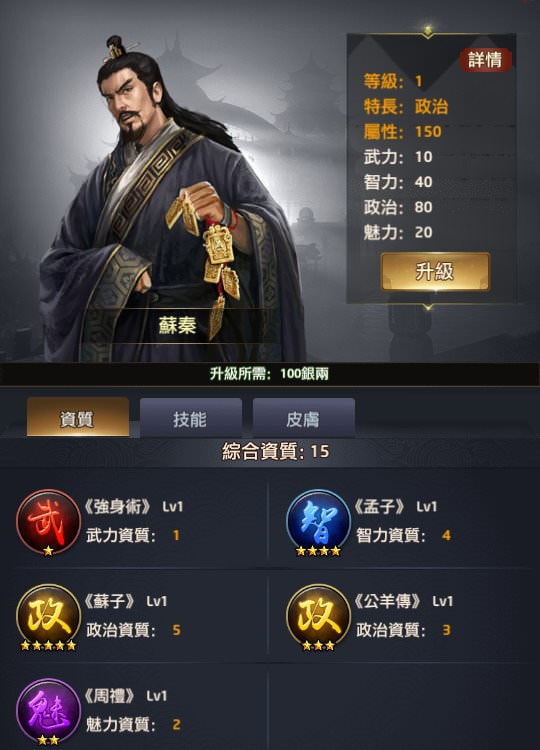 | 蘇秦 | 15 | 44 | 正六品 | 卓文君(尋訪) | 政治 |