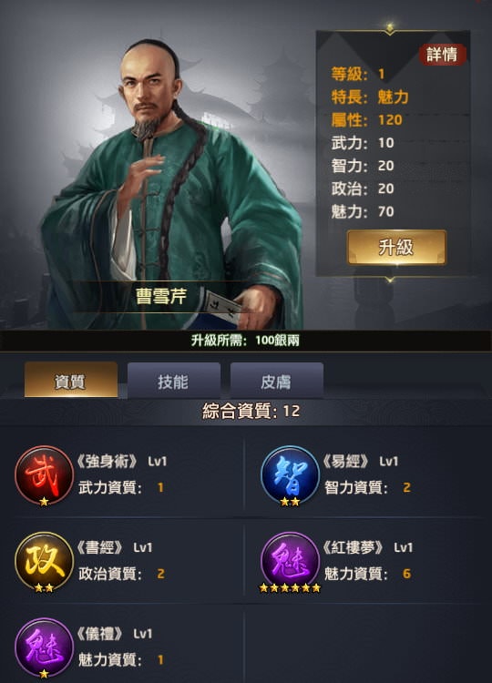 在各種玩法中,個人還蠻喜歡練曹雪芹當魅力將的,原因是1星技能透過書院+衙門還蠻好練的。