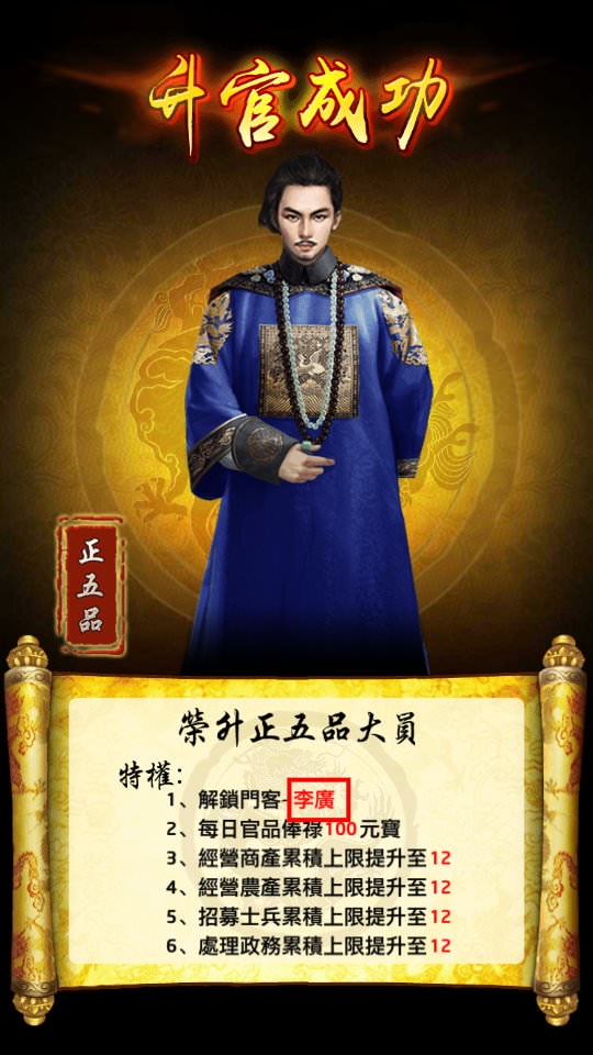 累積足夠政績後就能升級官階(官品),還沒升級前也能事先看到接下來會拿到那個門客。