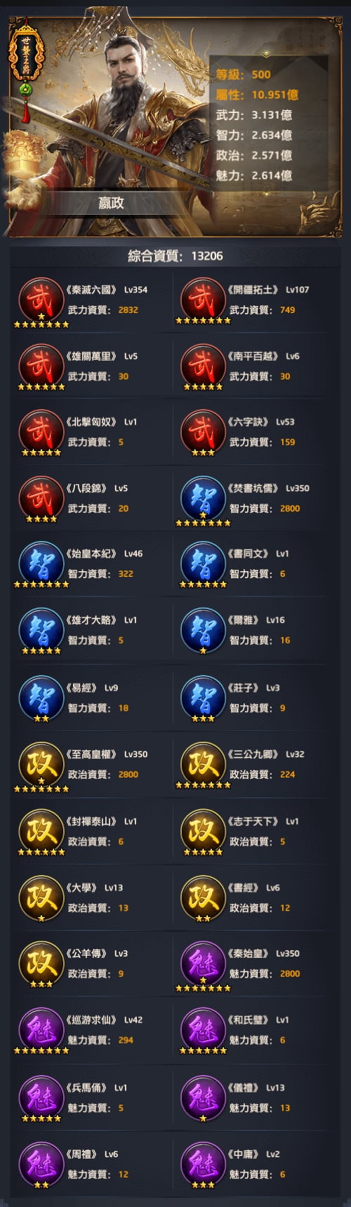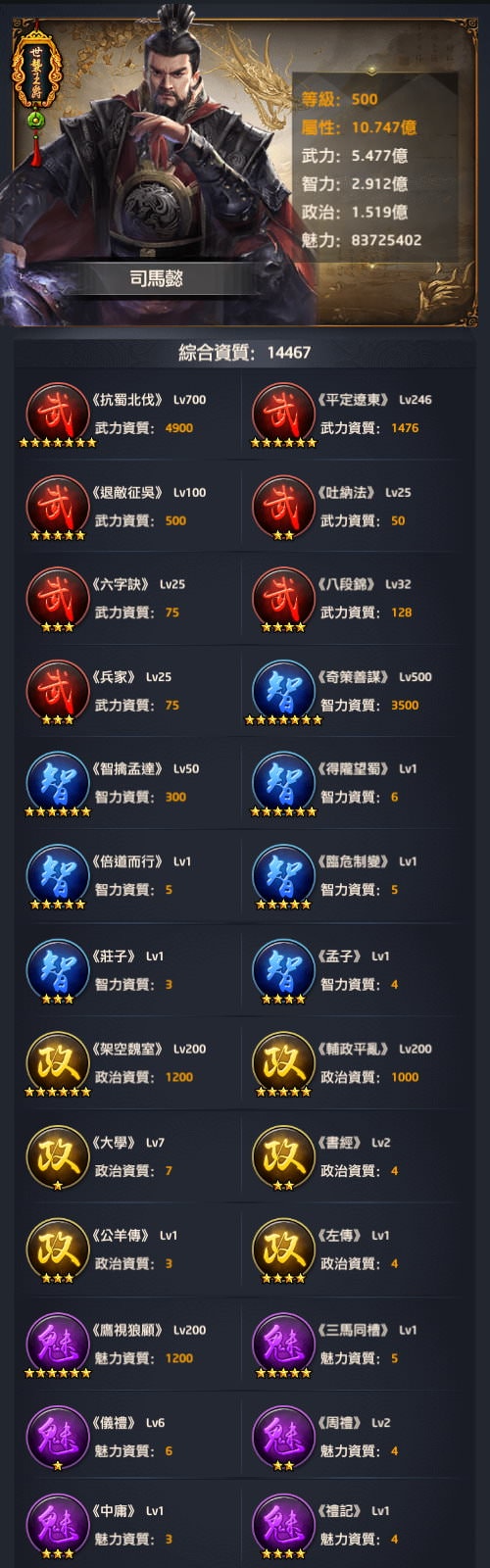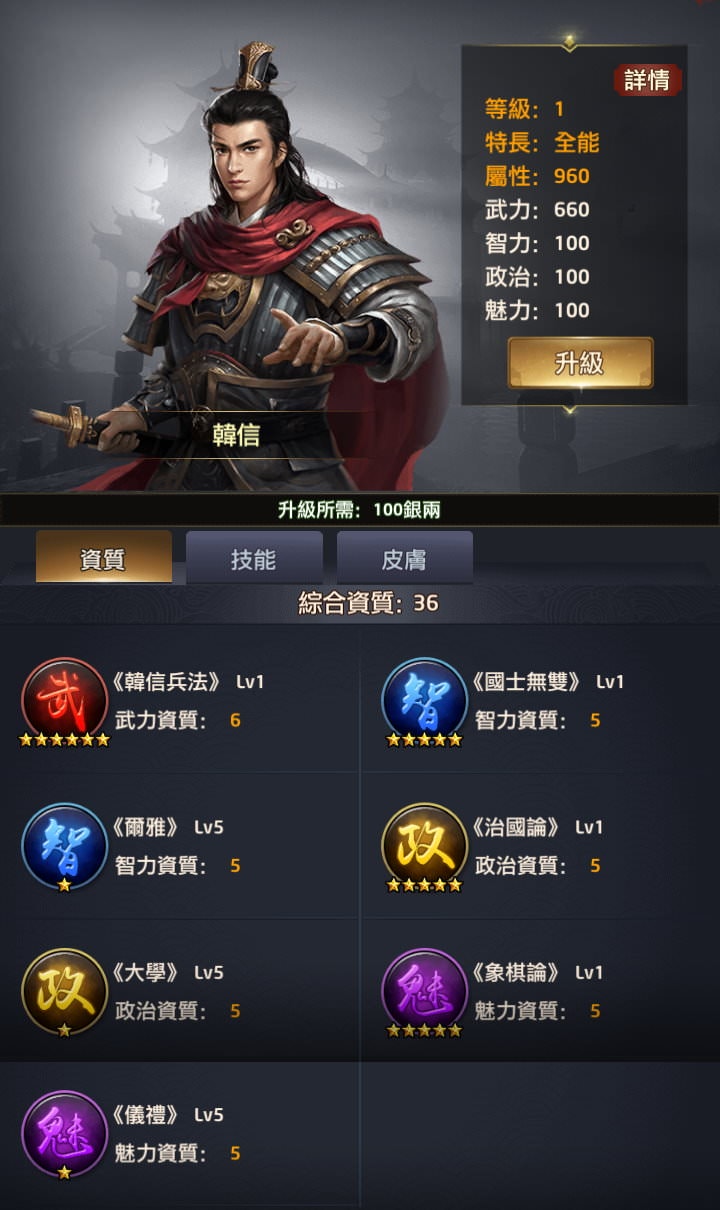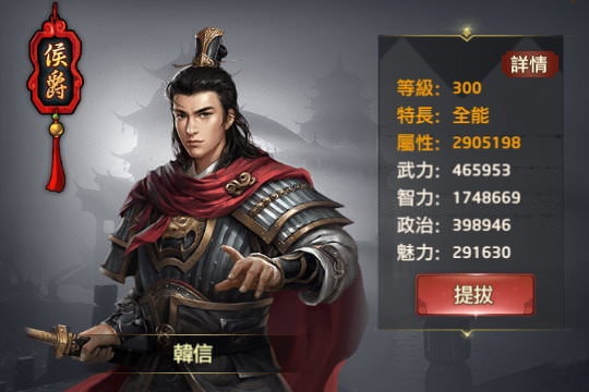 雖然韓信紅顏前兩個技能加的是武力,但韓信還蠻適合練智力的,5星智力的部份靠智力卷軸+內閣,1星靠書院+衙門,可以穩定又快速的增加智力資質。