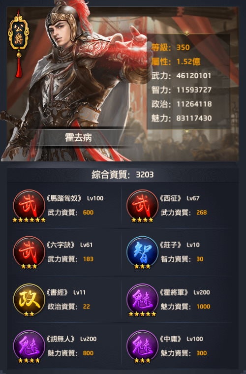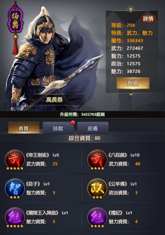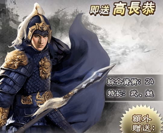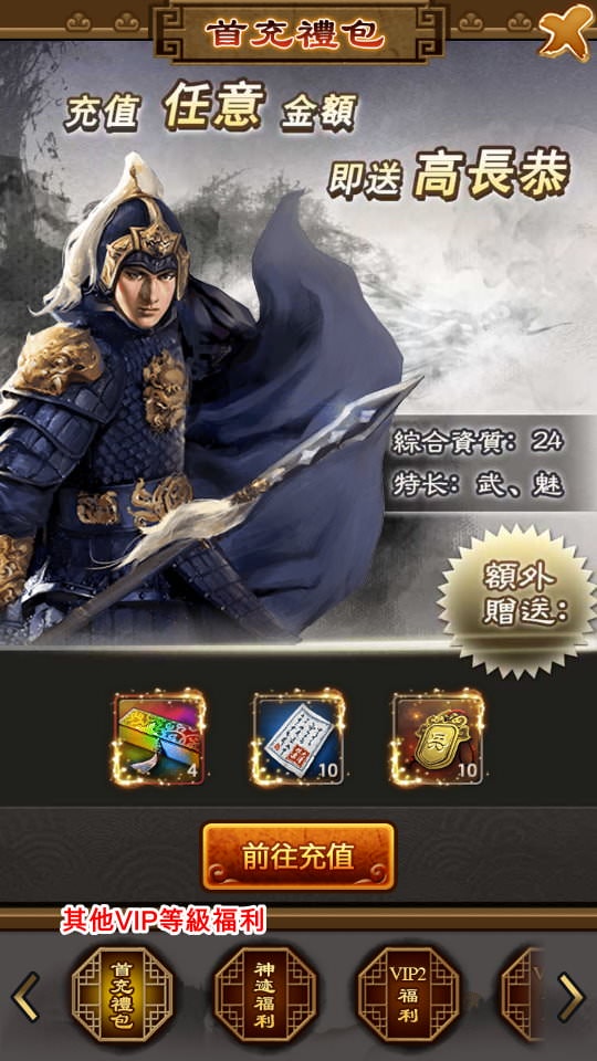 故個人是建議說若不打算充值到VIP 4(約台幣2千9),就不要主練高長恭,初期仍然是可以把他等級提昇,但就不適合餵他武力丹丸、浪費太多武力卷軸給他。