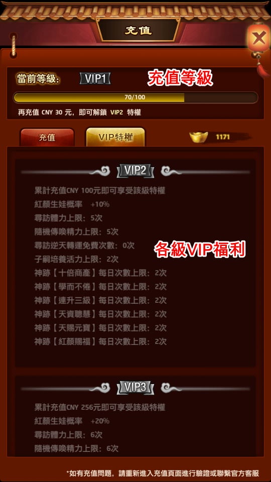 在遊戲中儲值達到一定金額就能提昇VIP等級,不同等級也會擁有不同福利。