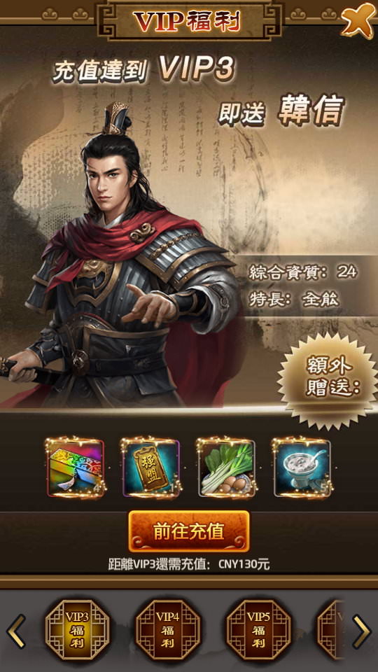 | VIP 3 | 至少 CNY 256(約台幣1,280) | 韓信 |