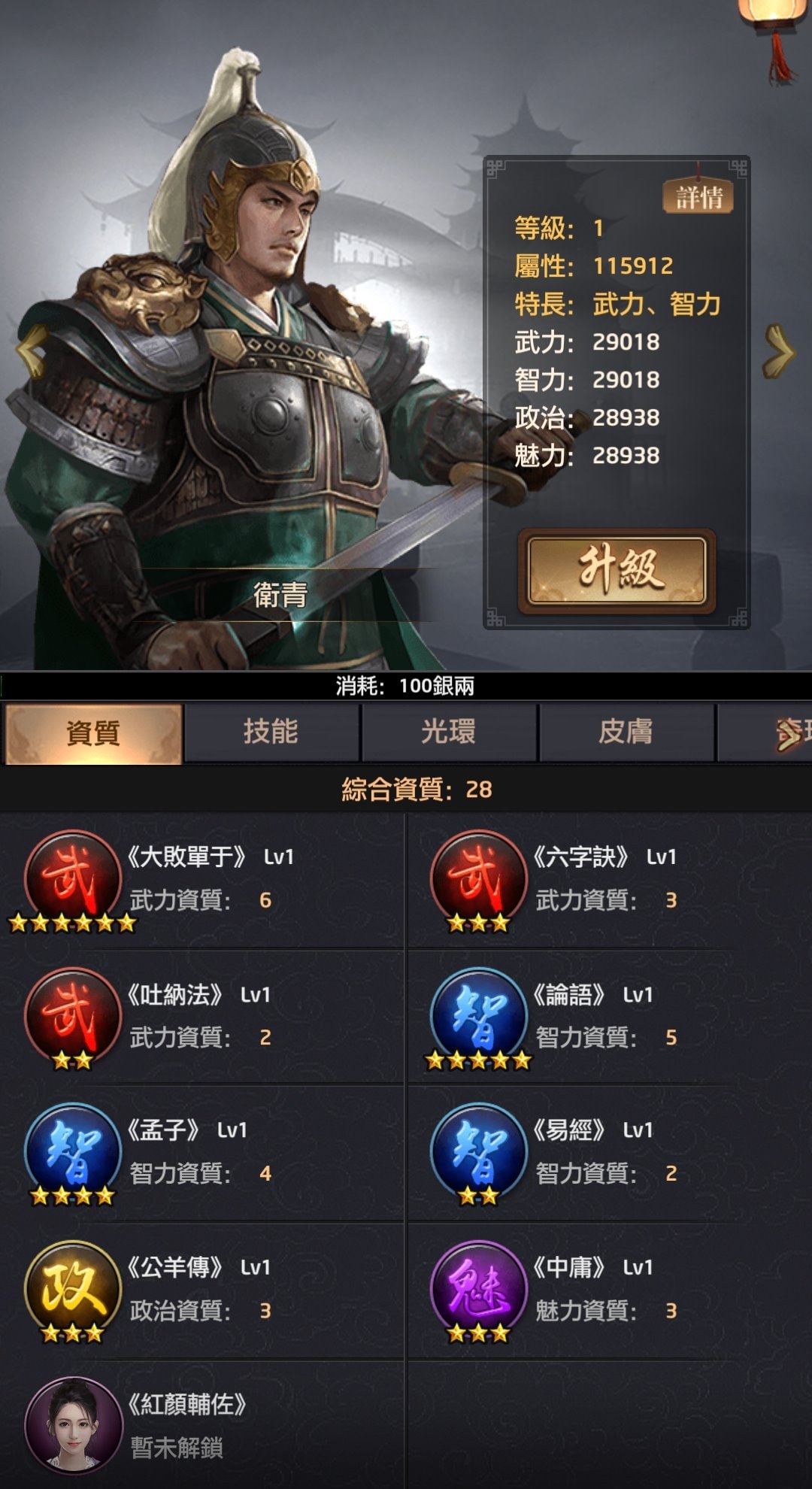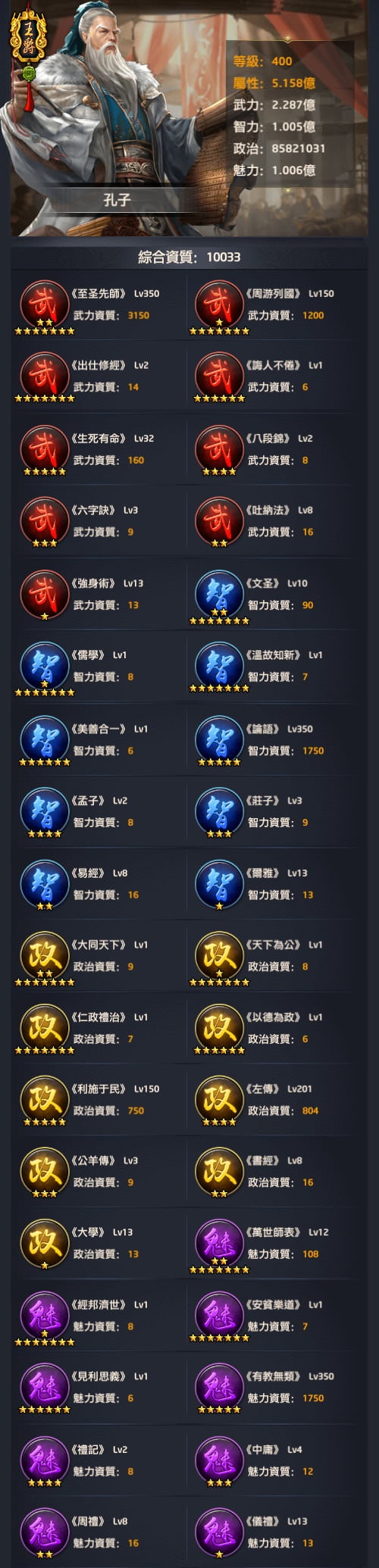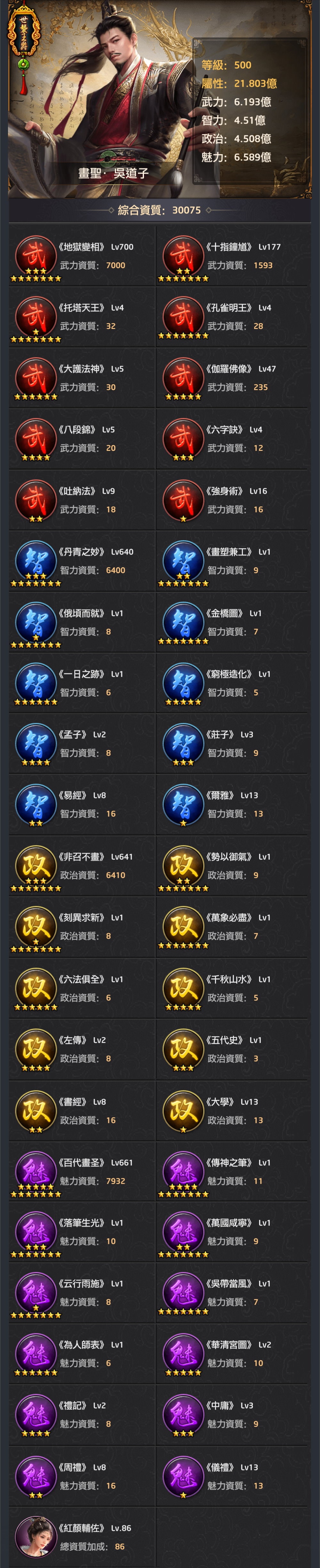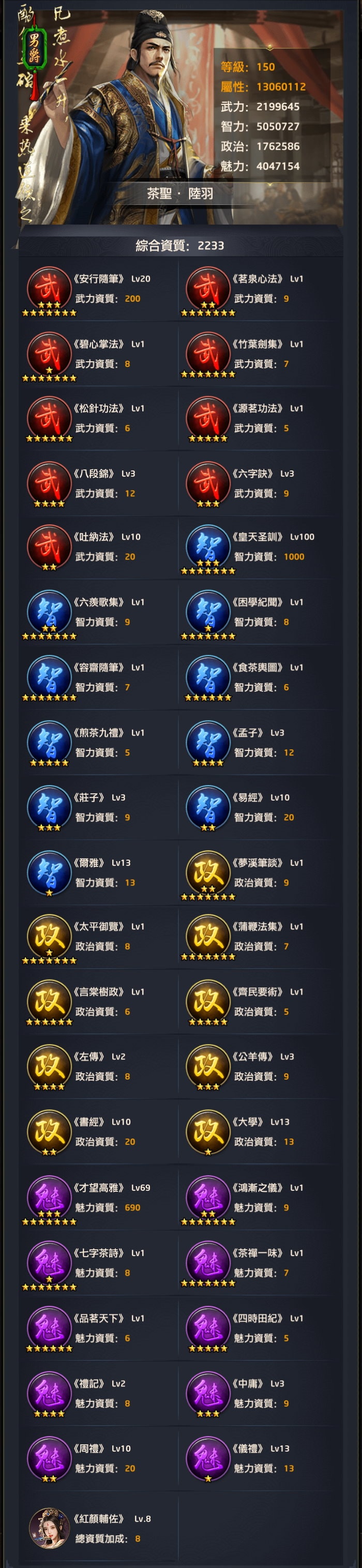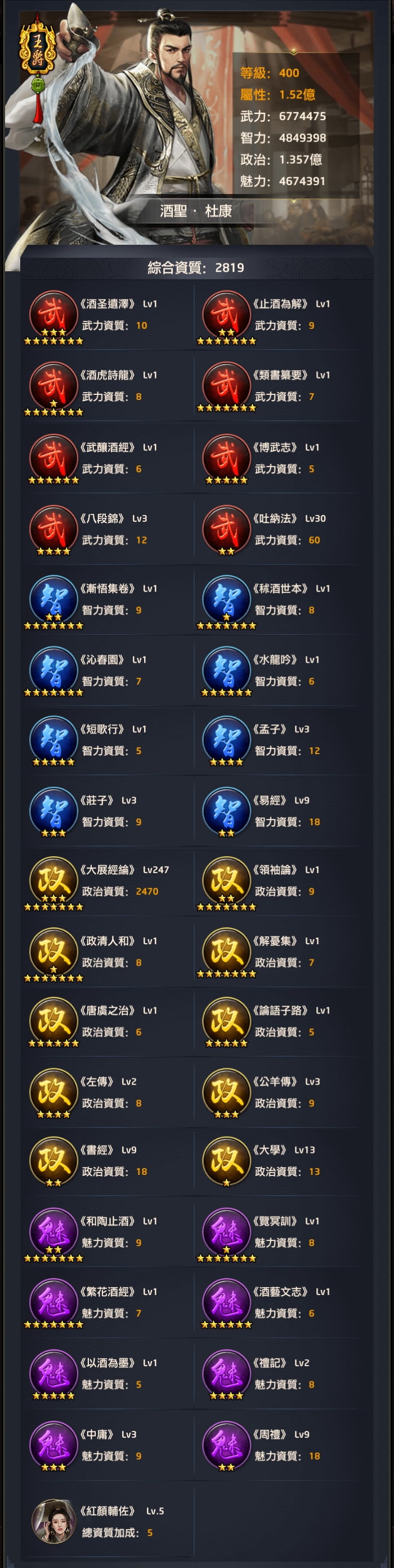 若想練他當智力主將,紅顏前兩個技能可以先不點(點滿共會+6萬武力),先點第3個技能(親密50即可)+智力%數,可以靠他把總智力撐高。