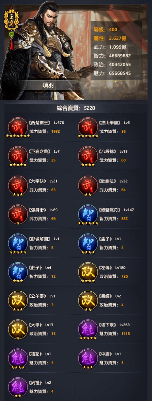 | 項羽 | 70 | VIP 9 | 虞姬(VIP 9) | 武力 | 134 |