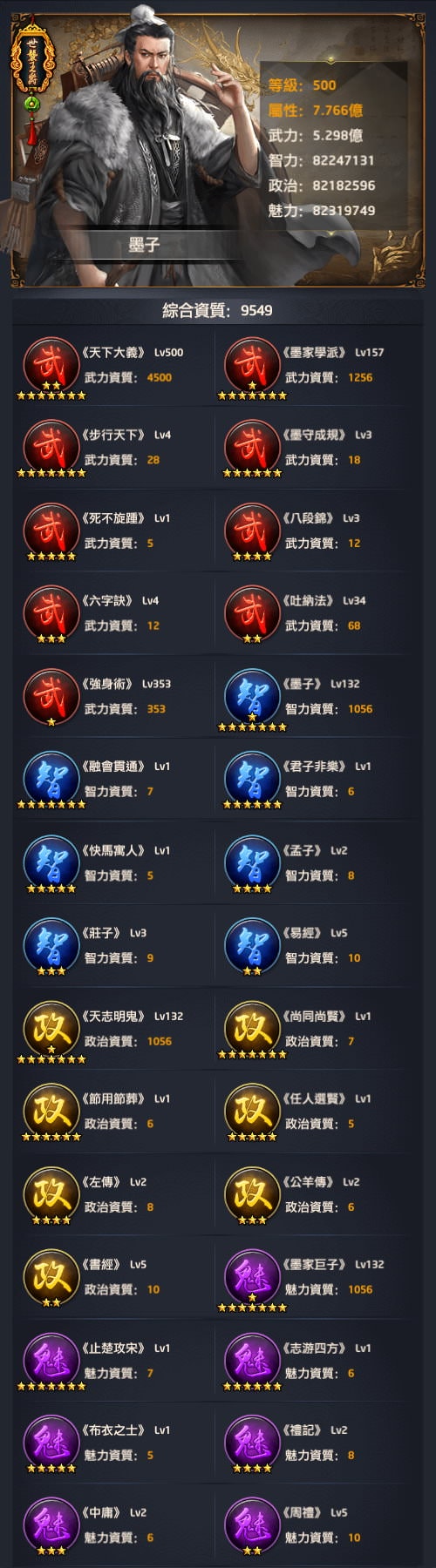 附註:上表中的「翰林總加成」是指「翰林院」中翰林全書達100級時,總共能加成多少資質,但翰林全書等級非常難提昇,需考慮自身充值狀況。底下門客資料中,棕色字體表示該「書籍」可透過翰林全書加成。