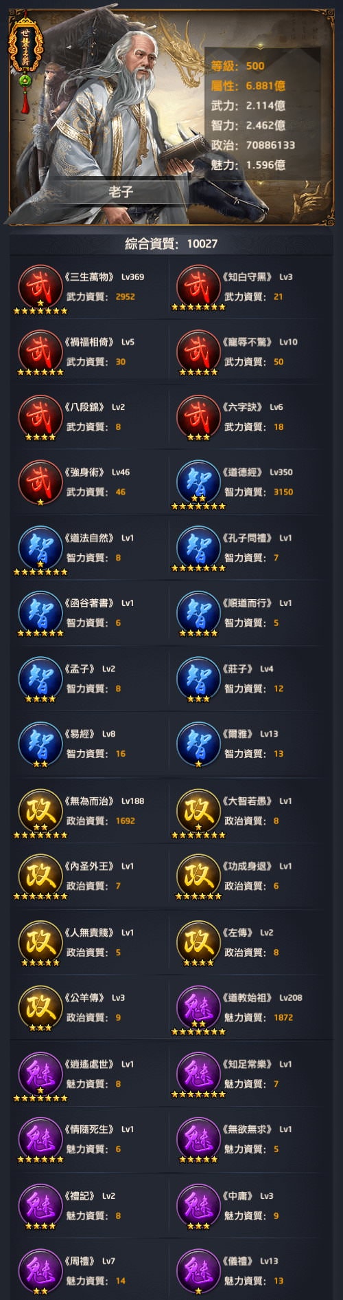| 老子 | 166 | VIP 15 | 息媯(VIP 15) | 124 | |