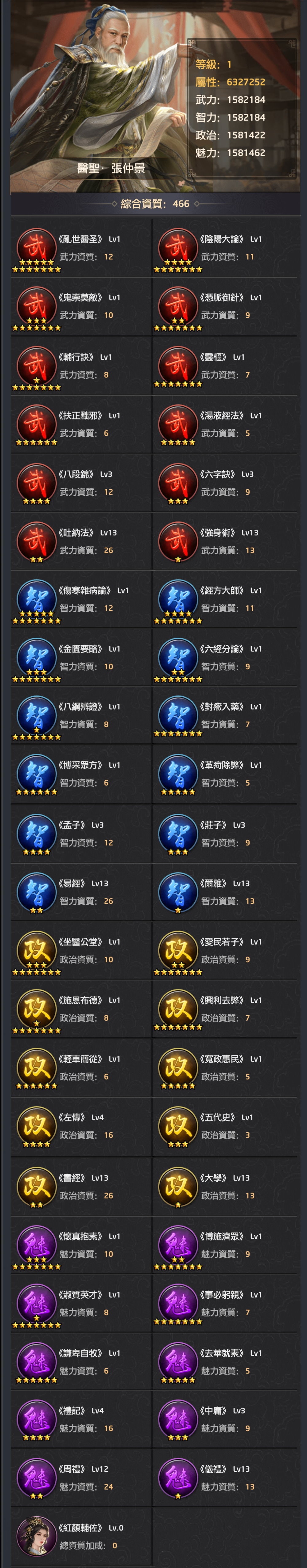 | 書籍/資質:凌煙閣 | 紅顏輔佐 | 藏經閣 | 整軍經武 | 雞智 | 濟世安邦 | 織造能手 |