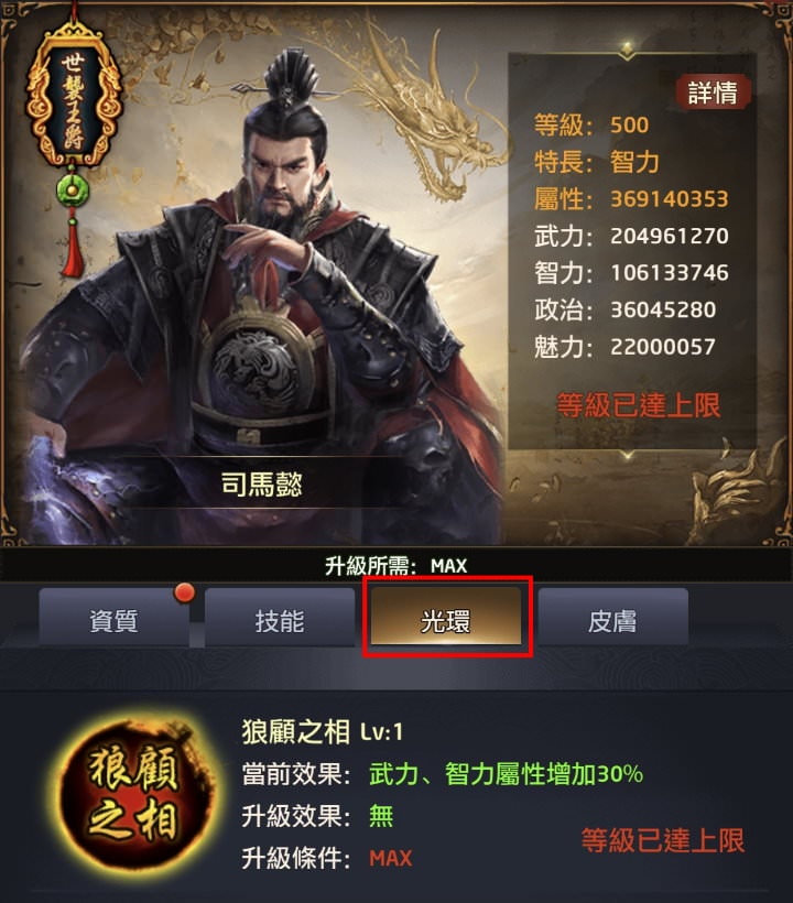 高V送的VIP門客中,如司馬懿(VIP 11)既有「紅顏」又有「光環」,一拿到就有武力、智力屬性+30%的加成。