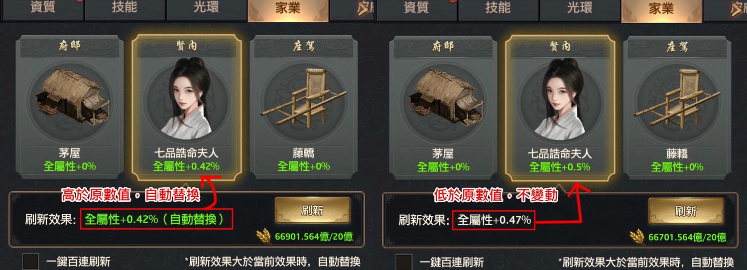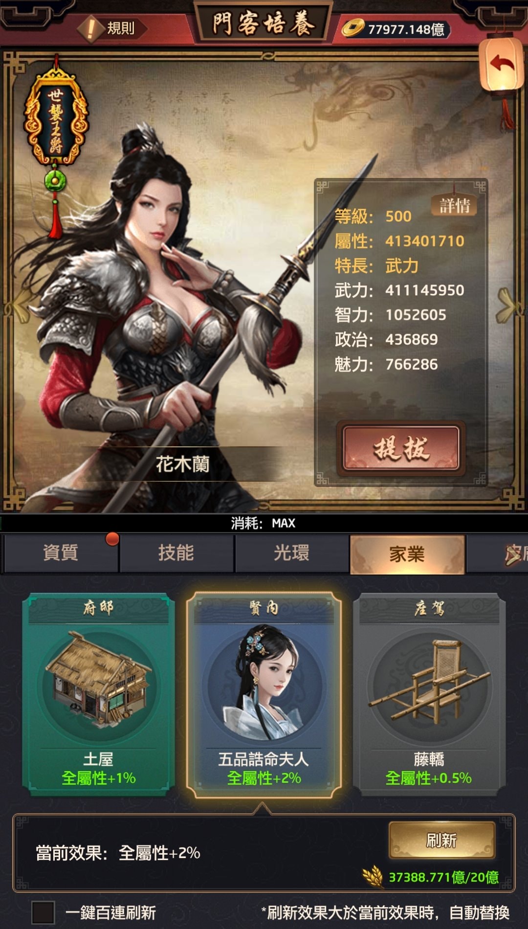 家業:門客達到世襲王爵時可解鎖,通過消耗資源刷新獲取全屬性加成,最高可達40%。