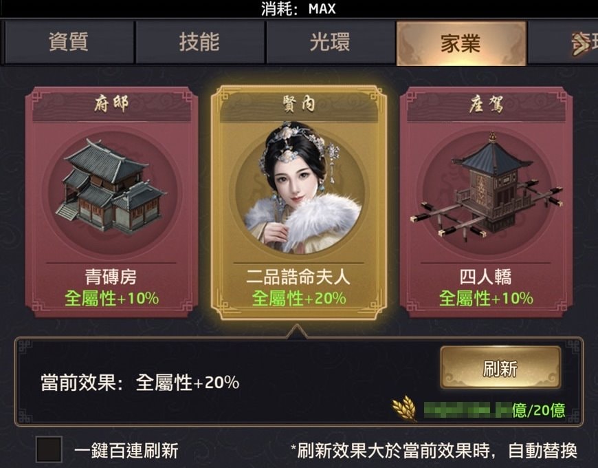 其中府邸得用銀兩刷新、賢內用糧食刷新、座駕用士兵刷新,每次刷新會花20億,也可點下方的「百連刷新」(一次2,000億)