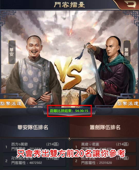 點「進入活動」後可以選一邊「派遣門客」,活動通常都3天,不用急著派門客,可以稍微觀察「雙方前20名」的數據來決定要參加那一方,只要在活動結束前派門客就好。如果怕第一時間沒派之後會忘記,其實大多數對決還蠻容易判斷勝負的。