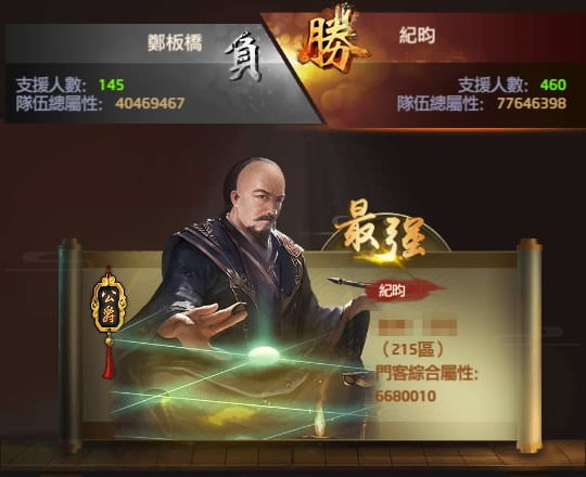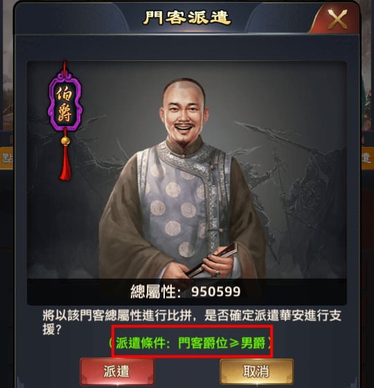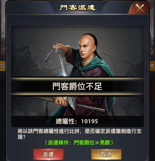 所以這邊會衍生一個問題,如果該門客你「卡59等」,那你根本沒機會參賽。個人是認為不值得為了這活動把門客升級上去,一來你這門客沒挹注過資源,衝上去屬性可能也不高,二來是這活動很頻繁,如果一直這樣做,那很快的所有門客都會超過59級,衙門不好打。