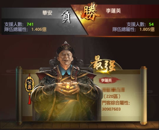 雖然華安是人人都有的門客,而高充值玩家幾乎也是會把每隻「四大梟雄」都練到穿黃衣,一位四大梟雄屬性可抵10位沒充值、小額充值玩家的華安。雖然華安人數有700多、李蓮英只有50多人,但李蓮英還是小勝華安。