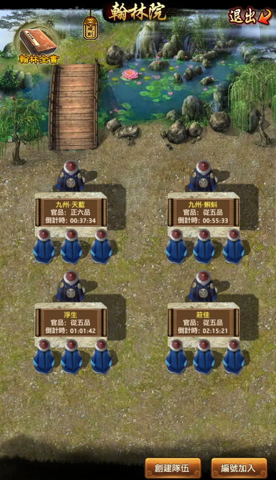 若要自己開課,點左下角的「創建」,「開桌者」(創建隊伍的人)的「官品」決定這桌翰林桌每分鐘能得到多少「翰林經驗」,此外開桌者可得到1.2倍經驗(多20%)。