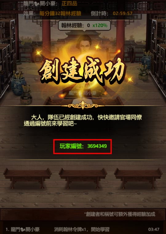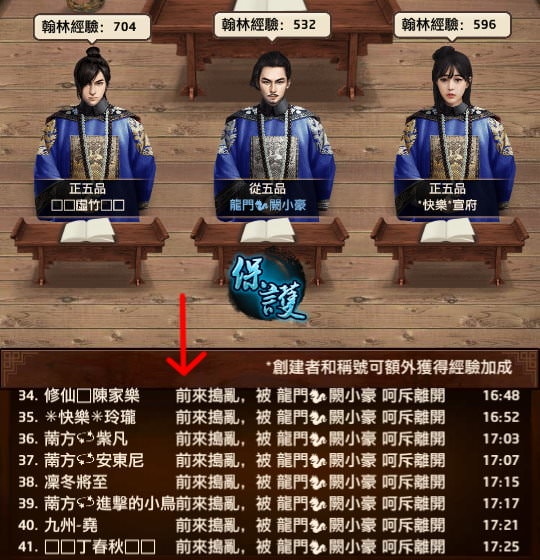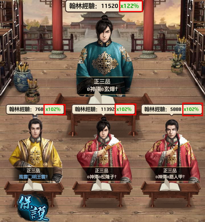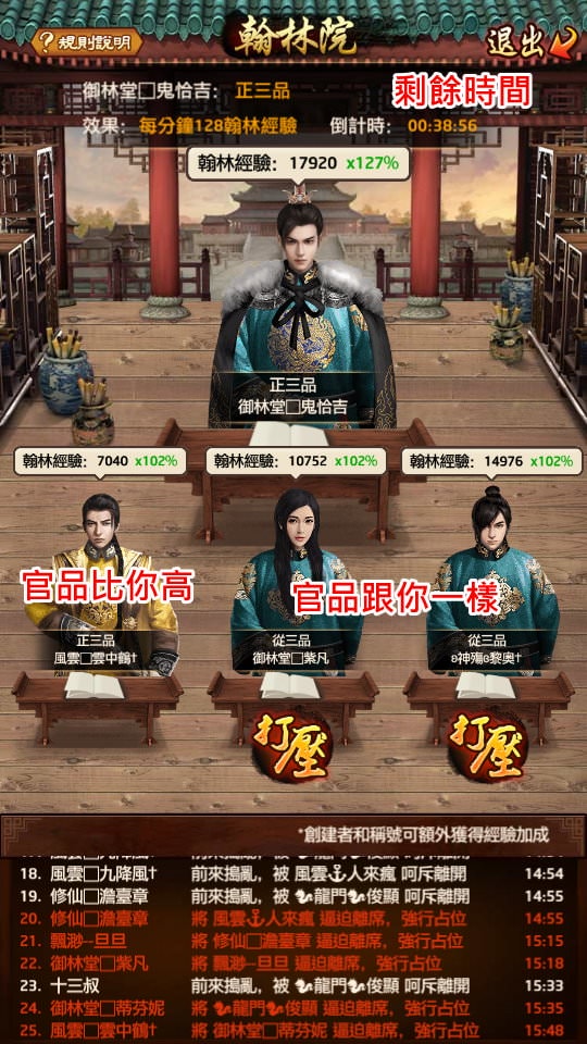 但是翰林的位置沒那麼容易坐,每個玩家隨時都可以來挑戰你,若守不住位置就會被踢走,中止學習。能坐幾分鐘,就能拿到幾分鐘的翰林經驗。